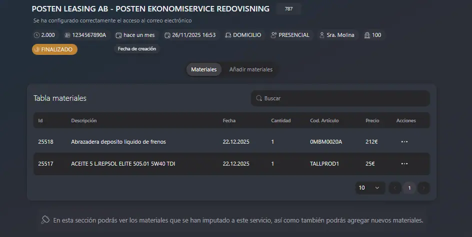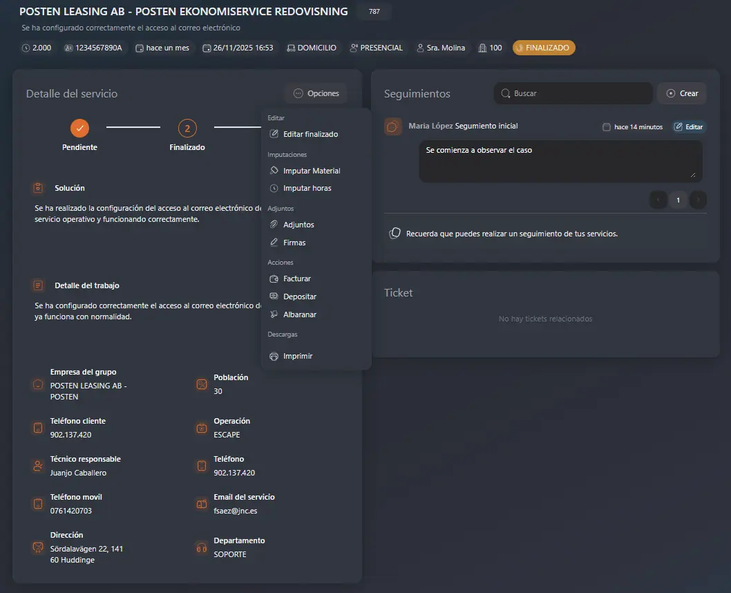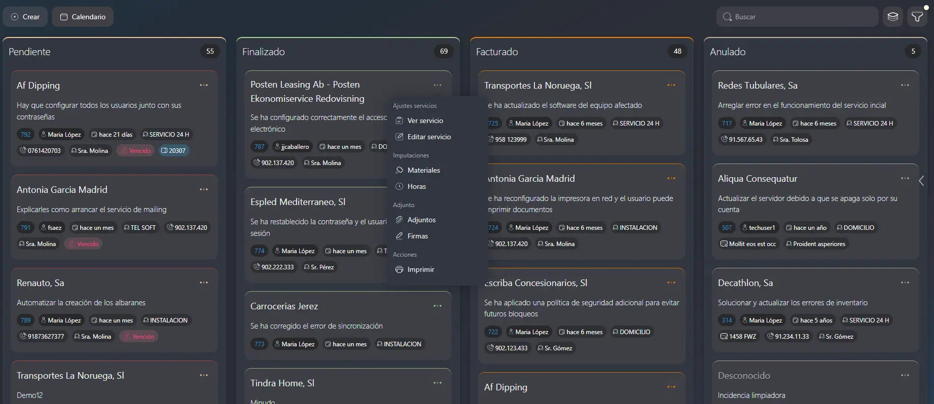 Visualiza el estado de tickets y partes y mueve tareas entre técnicos al instante.